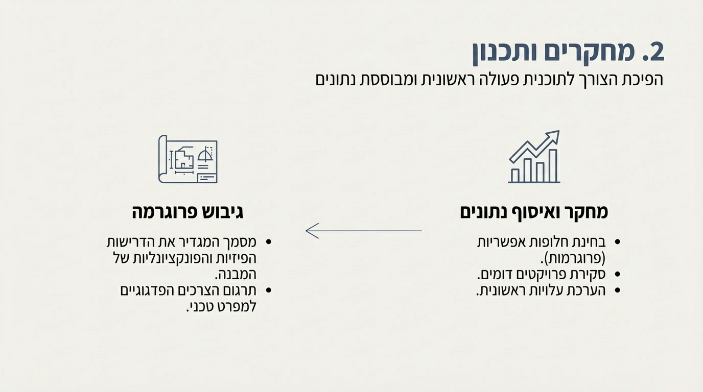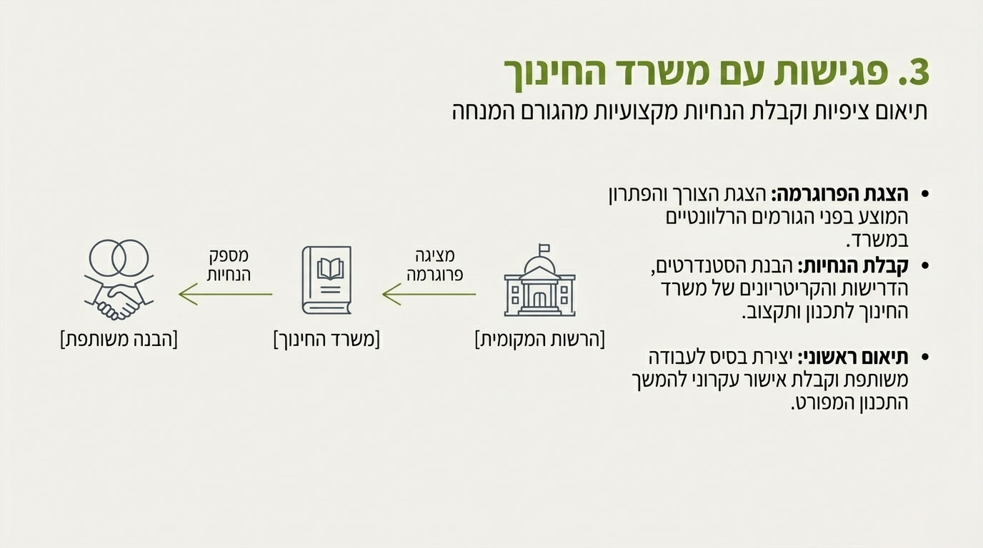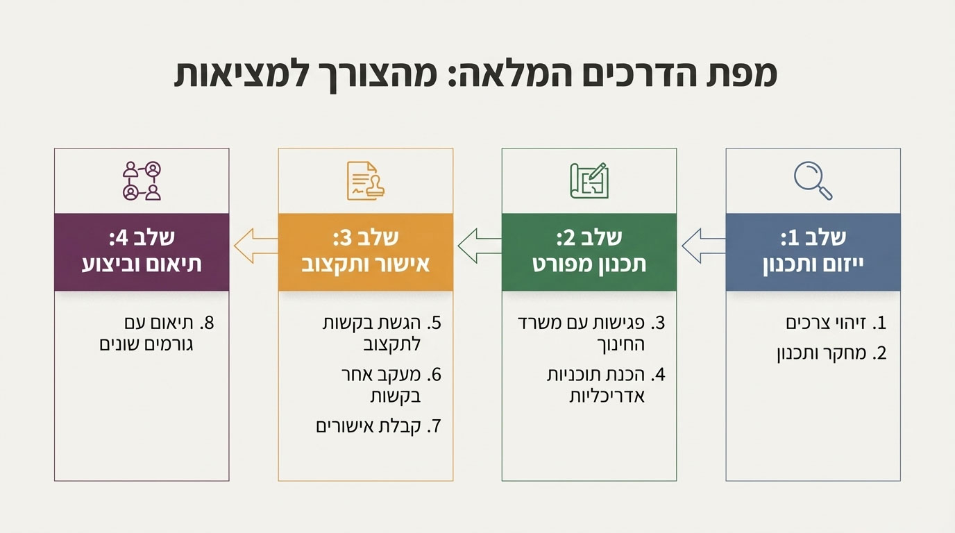 - ההכרה בצורך – הזיהוי של הצורך בהרחבת מוסדות חינוך נעשה הרבה שנים לפני היום, מול משרד החינוך וגורמים רלוונטיים אחרים, בעקבות גידול צפוי באוכלוסייה.
