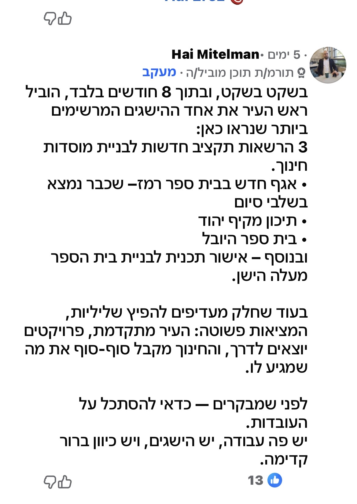 "בעוד שחלק מעדיפים להפיץ שליליות, המציאות פשוטה: העיר מתקדמת, פרויקטים יוצאים לדרך, והחינוך מקבל סוף-סוף את מה שמגיע לו. לפני שמבקרים — כדאי להסתכל על העובדות" כתב העוזר.