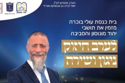 מאת מערכת יהוד-מונוסון אונליין | 25.9.2025 ביום ראשון, י’ בתשרי תשפ”ו (28.9.25), יתקיים בבית הכנסת עולי בוכרה ביהוד-מונוסון ערב מיוחד של חיזוק, ניגון ושירה, הפתוח לכלל הציבור. האירוע נועד ...